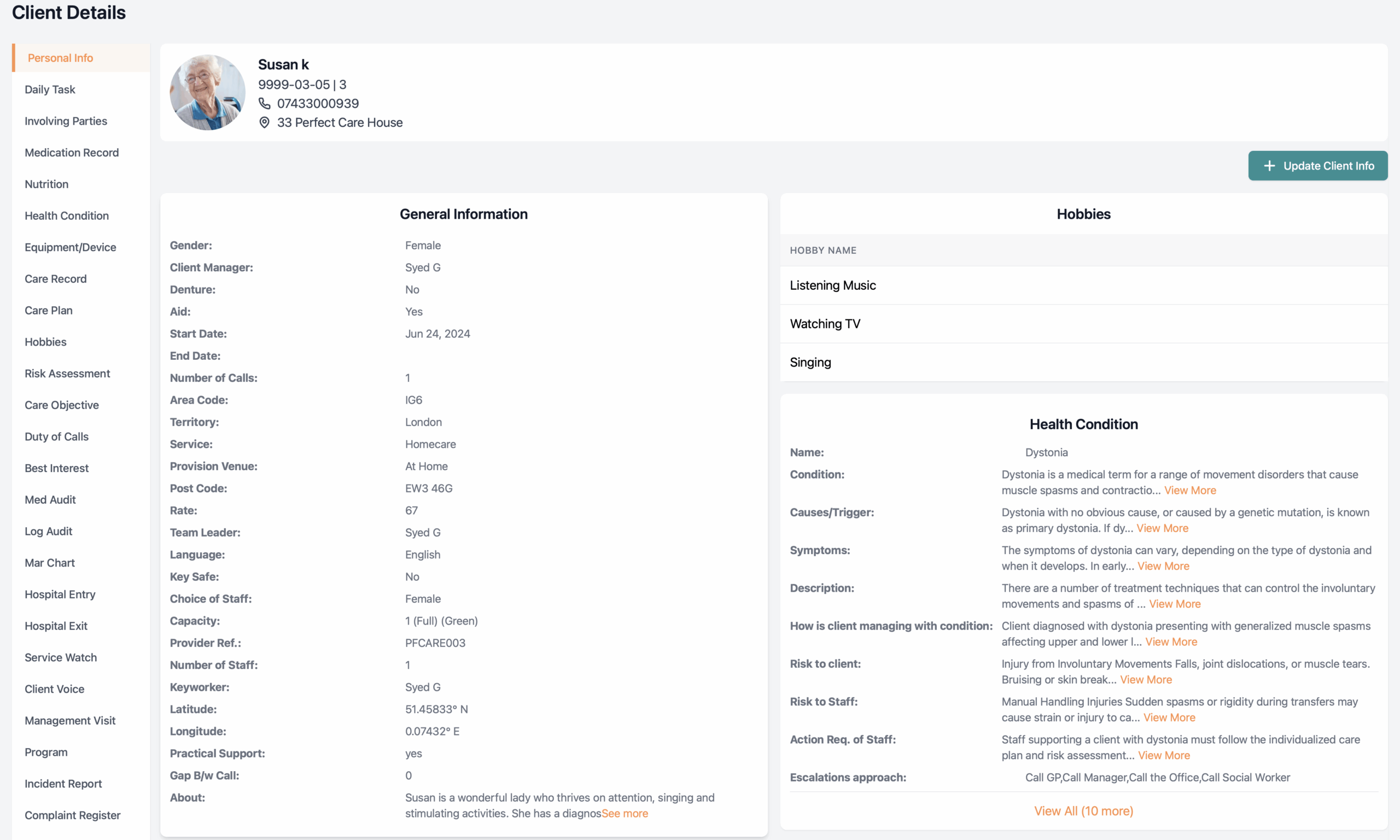 Options in Care360 service user’s profile includes: Files And Record, Complaint Register, Log Audit, Med Audit, Client Voice, Management Visit e.t.c